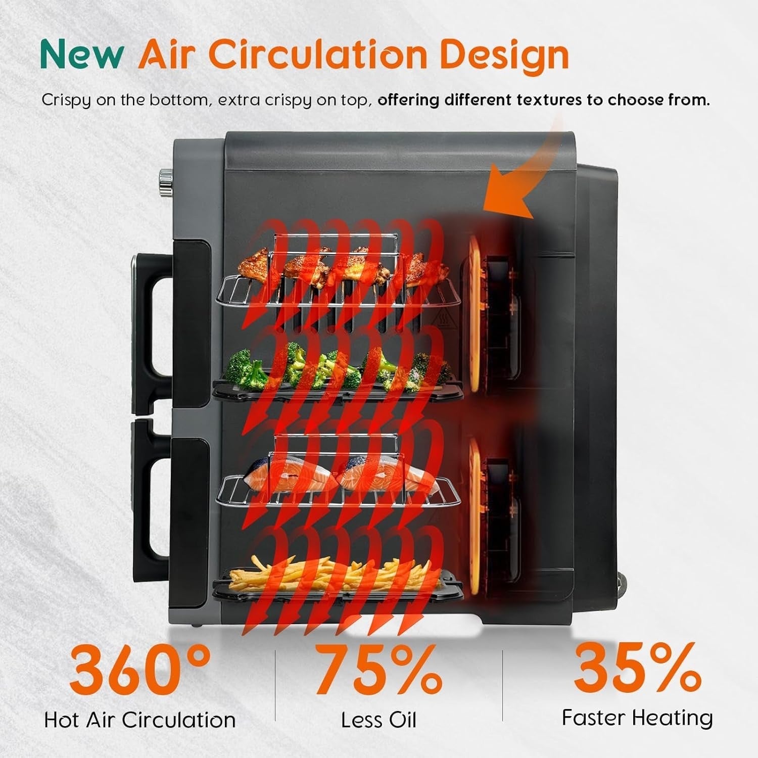 Cook smarter with this dual air fryer featuring a space-saving double stack design and generous 10L capacity. Designed for modern kitchens, this vertical air fryer combines powerful performance with flexible cooking options, allowing you to prepare multiple meals at once with precision and convenience.